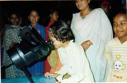 Hulaki, Looks like a telescope. You are doing a good favor to the children there. Good job! I myself am a good fan of telescopes (what type, that was, Newtonian) and I have a Galilaean one, but with prism reflector at the eyepiece. I now remember how my father used to teach me about the stars. I go out to my deck and use my telescope once in a while. Looks like gotta upgrade my tube. "Udeshya ke linu Udi chunu chandra Ek" Way to go! MM You are short, if that answers your question floating somewhere. You have a good picture there too, but nothing special!