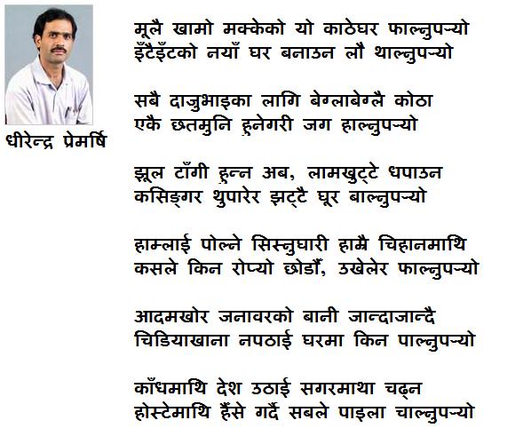 I would like to share here a recent ghazal by Dhirendra Premarshi which I think qualifies to be an anthem for democratic transformation of Nepal. May be I should recite this ghazal at the rally.
