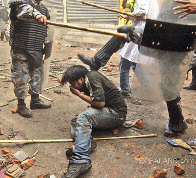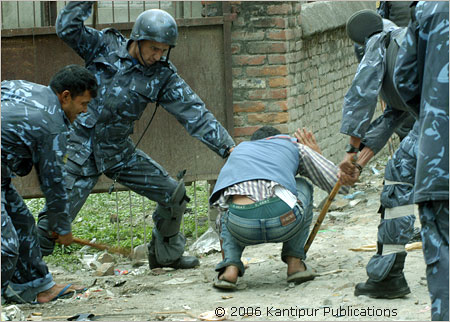 Thanks Symlyn and Katziman. Its so sad to see excesive use of force on those protestors. Yestai karan le garda yi sale dhide haru lai maobadi le thokda pani maya lagdai na. Kina bhane yiniharule payen bhane tyasai garera thokchan, kuterai marchan ta. I will be happy the day I see picture of Kamal Thapa and other Gyane's chamcha getting beaten by people in same way. I was reading about the press coference he had in KTM today. Was shocked and angry at his comments, those comments sound like from a retard nazi. "we will use more force to implement real curfew". I do not know what "more force" and "real curfew" mean. "the rule that government make is it is, no compromise no complain" about press not getting curfew pass. Yeslai ta chak ma jire khursani kochera pitdai ktm ghumaunu parcha. Please visit "salokya.merosansar.info" for current update.