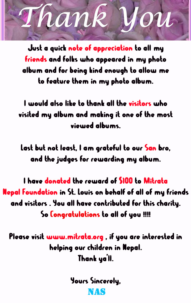 I am pleased to announce the winner of the first Ramjham Album Contest. The winner is non other than NAS who has diligently compiled and shared interesting photos from his collections. His album received the highest number of views as well as portrayed a good sense of ramjham - which was the theme of the contest. You can view his album entitled -Nas's World - HERE. Nas has been generous enough to donate the prize money of $100.00 to charity. Mitrata Nepal Foundation for Children will receiving the check this week. You can visit the organization site at http://www.mitrata.org Congratulations Nas, and I hope you will continue to share enjoyable and entertaining photos in Ramjham for all of us. Best Wishes, San PS: Visit http://www.ramjham.com/anamainpage.cfm for the ongoing ANA photo album contest ($200.00)