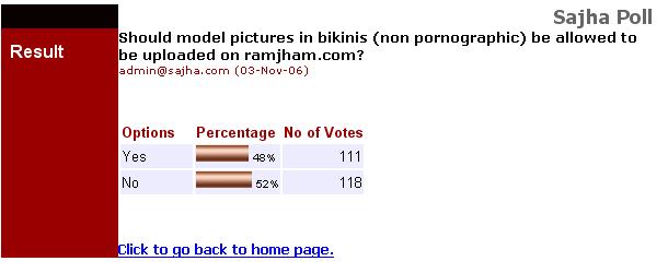 dyamn, My intention was not to make you angry or anything. I am sorry for using the word "sister" in my previous sarcasm. Here is one incident I should mention here. Few days ago, it was my lunch hour and I was browsing sajha while finishing lunch. And one of my frn suddendly appears on my back and asks me, "Oh man, what are you looking at? some kind of porn site??" And, when you talk about freedom, you should be careful that you are not stepping on other's freedom too. You can't run nude in a crowded mall (just because you felt like doing so), can you? Slakdemic, Same answer goes to you as well. I was not talking about ramjham; it was about the pics on the sajha's front page. Models wear those sort of clothes when they are shooting/posing; they don't walk everywhere in those sorts of dresses, do they? Since we have this clean site(without samjhan pics), the problem is solved. No more worries..peace..