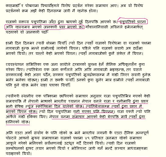 It's sad that people stoned at the escorts of king's car. We're creating this bad culture. But I'm still against monarchy system. It just creates slavery. I don't want to sing the song or anthem saying that king is on my head and I put my head on queen's foots (I heard this from Bhutanese song, youtube video, posted by I_nepali). We had many patriotic songs made like that. King and the whole royal people never give damn about the poor people. They just never cared, and are never going to care. I've never heard king helping poor people. Whenever some news get published about poor people asking for help either from diseases, or children's conditions or others, they just turned blind. But people of Nepal always gave donations and tried to help them. The government also didn't do much. A classic example of it is government's decision to provide 2 crore for helping wealthy person like king's sister. It's just enough, and we need a change. From Prithvi Narayan shah's time, I've not heard single time king going to help people. I'm against monarchy.