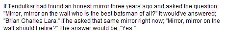 Bidhan40, Finally somebody stepped forward to speak the reality hoina ta? I luv this comparison stuff and feel even better when Lara edges out Tendulkar. Tendulkar may have been a run machine but not a real match winner. How many times has he thrown his wicket at the key moment and how many times has he won match by himself for his team, can u count?