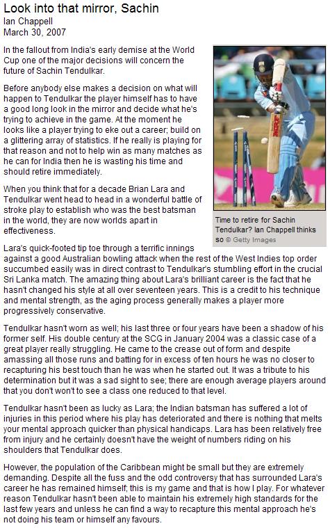 I can't understand why people are giving so much thought about the opinion of a person who is using the anti-Indian cricketers sentiment for his personal favour. First of all, Mr. Ian Chappel has compared Test Cricketer Sachin with Test Cricketer Lara. His logic is completely false because he wants Sachin to retire from one-day cricket based on his test performance. And, test player Lara or test player Dravid was test player Kallis was always better than test player Sachin because Sachin was never a kind of player who would play 35 balls to open his inning. And the example, Ian highlited in his article from 2004 inning was an example of Sachin's determination as he was coming back to form after a string of innings of 8,7,55,1,0,DNB,1,37,0,44. He was struggling for runs and he came back determined with 241 N.O against Australia and in Australia. The inning was followed by 60 N.O and 194 N.O. And regarding Sachin as a One-day player; in last 25 inning Sachin averages 41.90 , with 2 centuries and 6 fifties, Where as The Great Lara has an average of 37.22 with no centuries and 4 fifties. YOU CAN'T BLAME AN INDIVIDUAL FOR THE TEAMS FAILURE. SACHIN WAS GREAT AND IS GREAT CRICKETER. IT IS JUST THAT OUR EXPECTATION HAS INCREASED AND THE TEAM HAS NOT BEEN GOOD ENOUGH. AN INDIVIDUAL CAN'T CARRY THE BURDEN OF 1O OTHER FAILURES. Thanks.