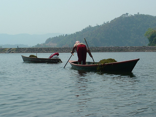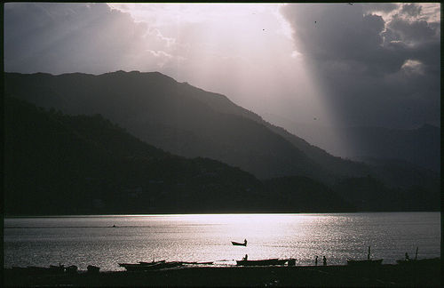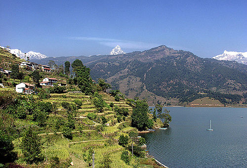 Fishtail peak, Sarangkot Tower and a boat without sails in Lake Fewa