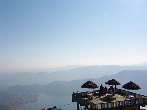 A restaurant in Restaurant overlooking Pokhara on a humid day