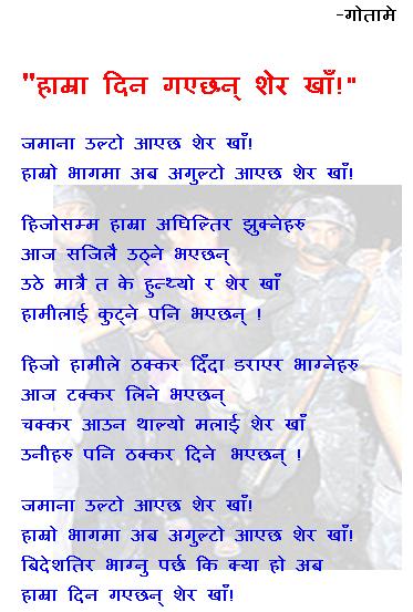 गीत चैं खास्साको लाग्यो है मलाई त:) किन काढाँ रोप्यो नि म आउने बाटो मा.... ****************************************************** हे इन्द्रेनी (म्याडोक्स् को मम्मी), तिमी पनि भर्ना भाको यो इस्कुलमा ? खुशी लाग्यो तिमीलाई पनि यहाँ देखेर ब्र्याड ब्रो को के छ नि हालखबर ?