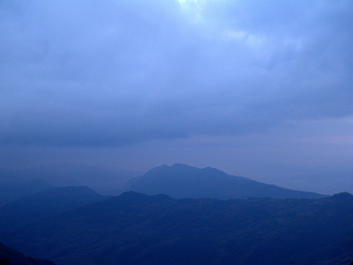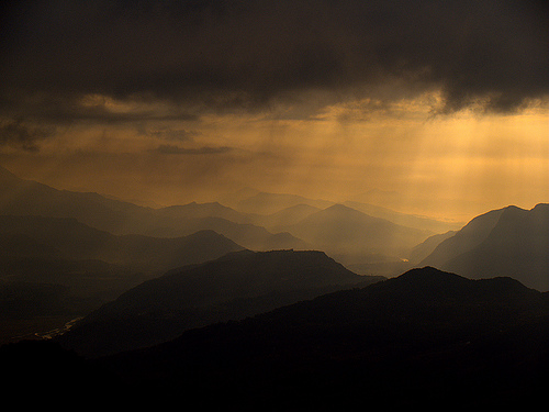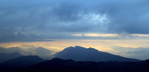 Shafts of light across south of valley to the Mahabharat range.