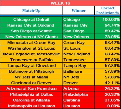 ~*~ NY Giants at Washington ---------> NY Giants Seattle at Tampa Bay -------------> Tampa Bay Pittsburgh at Cincinnati------------> Cincinnati Oakland at NY Jets ----------------> NY Jets New England at Tennessee ------> Tennessee Jacksonville at Kansas City-------> Jacksonville Detroit at Dallas--------------------> Dallas Cleveland at Houston -------------> Cleveland Carolina at New Orleans----------> Carolina St. Louis at Minnesota-------------> Minnesota Miami at Indianapolis---------------> Indianapolis San Francisco at Denver ----------> San Francisco Buffalo at Baltimore----------------> Baltimore Arizona at San Diego---------------> San Diego Atlanta at Philadelphia -------------> Atlanta Green Bay at Chicago--------------> Chicago What happens if I get 16-0 this time?? Do I still have chance :-?? Happy New Year Guys!! :-)