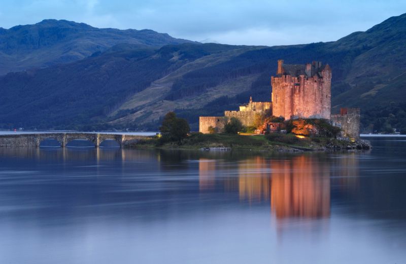 Jokemaster, That's Eilean Donan Castle in Scotland. I knew it - it'd got to be from the tartan country, somewhere near Loch Ness :)) check this website: http://www.castles.org/castles/Europe/Western_Europe/United_Kingdom/Scotland/Eilean_Donal-Highlands/index.htm