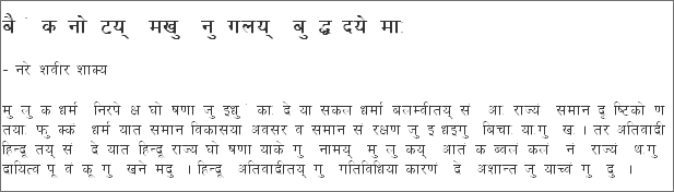 - Lasaye Hangu Birodhya phukkon mye ya nitin Dakale nhapan jigu dunugalan nise aapalan aapalan he Subhay dechhana chowna Bhaju Ji Newa Ju Yaat. - मस:सा सयेका दिसँ, स:सा छ्यला दिसँ- Chanaa tarkaari ju, chhin Paychhi dhaidila... Mann tasakan he layta... Jhi Newa tayeta thana tho thread ye woya chhuna scope scope dhaka halachwoni magu then machown, jhike guli na du... ale guli na phu... wo dakkwon jhishan share yana he chwonagu du ni.... Suna na woya chha bhashabaadi ale dharmabaddi dhaywon, jhipeen lichile majyu.... Ji ta newa juya mwyay khangulin tasankan tasakan he garbha du... "Newa Jhi Newa He Juya Mwyay Nu"-- - Ale jhi avant grade ju, Jhi na lha Newa he the chown ni, Ki makhu? Makhu Khasa la "Nhu da ya Bhintuna. (although belated!)" dhaka chowya hayadi he makhuni....ki gathe....?