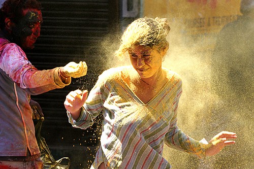 Holi Beauty or Beauty of Holi. You decide folks! The Hindu festival of Holi which honors the mythical demoness Holika is associated with intense color and general frivolity. Every day of the March festival is inspired by a particular color, with the final evening culminating in a riotous celebration of every shade. During the days prior to the final celebration, a pole is installed in the street made of bamboo and cloth. This is a ceremonious installation which represents the mythical tale of a king who used to hang his maid's garments high up in the air when they were bathing. Another name commonly used for the festival is Phagu, linking it to the sacred red powder that Hindus smear on their face. Bonfires are also common during Holi and the King's pole, along with various other artifacts, are burned on the final night. Many youth groups organize special Holi outings and commonly throw water balloons and colored powders at passers-by, all of which is generally acknowledged as being part of the fun!