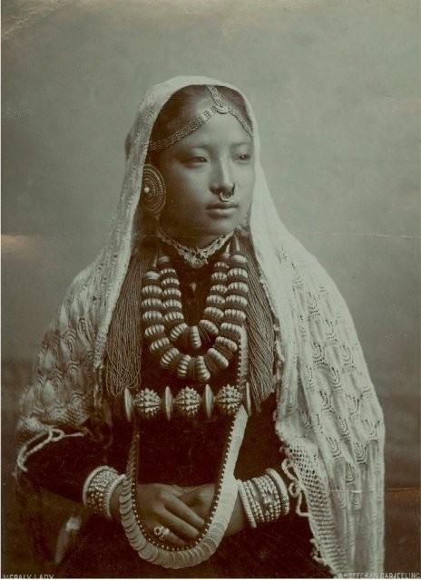 Kirat Ni Beauty taken in 1890. The Kirat community is counted among the world's ancient communities. The mention of it can be found in the Rig Veda too. The Kirats had created their own civilised society before the Aryans reached Sapta Sindhu, and was ruled by their leader Shambar. But after losing all their territories, in the 40 years of long war, they headed in search of new lands. According to Early Races of Mankind by Sir John Hammerton, Vol. I, page 434, when the Aryans came to India for the first time and started to advance towards the hilly regions, they had to fight against a Kirat-Ashur king whose kingdom was situated on the bank of river Indus in the Himalayas. His name was Shamba Ashur. He was defeated in the battle, so he left his place and came towards the east and established a stronghold in the Kinner land which is now known by the name of Himachal Pradesh in India. In this place, a horde of Mongolian people came and intermingled with this stock of Kirat people and constituted one big Kirat race. Gradually they spread towards the east and resided in the Himalayan region of Nepal, Sikkim and India. They usually speak in Tibeto-Burman language style as that of Newar, Magar, Gurung, Murmi, *Sunar, Lepcha and Toto and also in the style spoken in East Nepal by Dhimal, Thami, Limbu, Yakkha, Khambu and Hayu. The Kirats' lifestyle and their cultural activities are all governed by Mundhum. Mundhum is the folk- literature of the Kirats' and is one of the world's most beautiful epic, which has been passed from time immemorial through verbal tradition. In Mundhum, the knowledge of the universe received by their forefathers, the beginning of life on earth, the heroic deeds of their forefathers as human, and their extraordinary works as above human, have been stored. Points to be taken: * "The Kirat are mentioned in Indian epic drama such as the Mahabharata. According to Nepalese traditions, they occupied the Kathamndu Valley(Nepal) before the Licchavi dynastry just prior to and during the years of the Chraistian era (Regmi 1969: 54-64). Nowadays the ethnic groups going by this name live in eastern part of Nepal: the Rais, Limbus, and Yakhas. The Sunuwars also claim to be Kirat. Shafer has shown that the Sunuwar dialect closely resemblences certain Rai dialiect (Shafer: 1953: 356-374). A large number of Sunuwars, when living in the capital or in India, abandoned their Sunuwar name for that of Kirat, as many people believe that they belong to the polluted "occupational caste" of the goldsmiths (Sunar) (see Mcdonald 1970:146, fn.23)" ~ Himalayan Anthropology, Page 174 By James F. Fisher