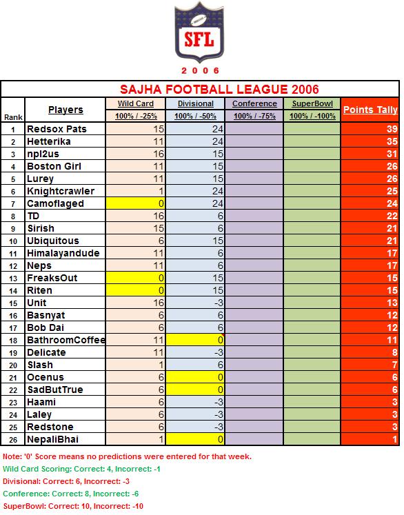 Wow !! What a week it was.....Ironically, Both NFC Teams took advantage of the Home Field, whereas both AFC teams lost at home. Here's our scoring so far....Note that there is a slight change in the scoring from last week. Keep your predictions ready for Next week Guys....Can't believe its almost over......!