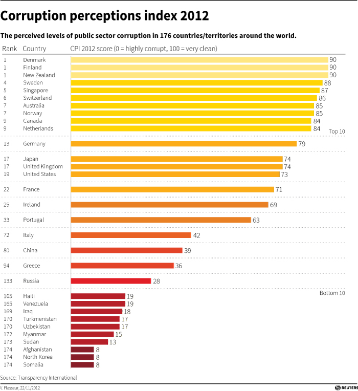 Where is Nepal and India in this list? In the middle portion of the chart...no way! This chart is totally wrong;).I am hoping they got negative scores (0 means highly corrupt but I am assuming they got less than that - may be negative score). That's why they are not listed in this chart. Anyways, interesting chart. Felt like sharing with you guys!