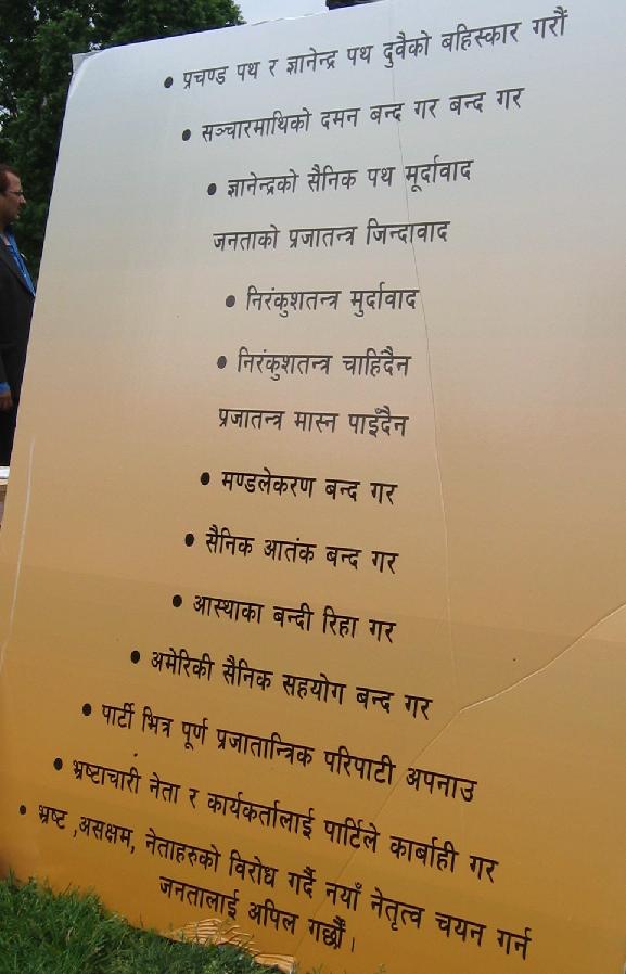 Starting part 2 of the thread "JOIN DC RALLY..MAY 15..NEPE " ( - http://www.sajha.com/sajha/html/OpenThread.cfm?forum=2&ThreadID=21328 ) -यालीबाट फर्कदा एकजना तन्नेरी युवकले कुराकानीको सिलसिलामा सोधे- किन केही शिक्षित युवकहरु नेपालको राजतन्त्रलाई समर्थन गर्न पुगेका ? मैले भनें ? तिनीहरुको मनभित्र पसेर हेर्नु, वास्तवमा त्यो राजतन्त्रप्रतिको सकारात्मक समर्थन नभएर अक्षम र भ्रष्ट नेताहरु प्रतिको नकारात्मक विद्रोह हो, त्यसैले मौलिक रुपमै खराब कुरो होईन त्यो । त्यस कुराकानीको भोलिपल्ट मैले अर्कै सिलसिलामा साझामा पोष्ट गरेको निम्न शब्दहरु त्यही कुराकानीको विस्तार भने हुन्छ । " डेढ दशक सम्म आफ्नो अक्षमता, दिशाविहिनता र भ्रष्टतालाई प्रदर्शन गरेका नेतामाथिको प्रहारलाई राजाको समर्थन वा प्रजातन्त्रको विरोध ठान्नु दैत्याकार अज्ञानता र मूर्खता बाहेक के होला ? हो कतिपय मान्छेहरु अहिले राजालाई तह लगाउने कामलाई नम्बर एकको प्राथमिकता र अन्य कामलाई दोश्रा-तेश्रा चरण/ प्राथमिकता को काम ठान्दछन् । मेरो यसमा विशाल असहमति छ । मेरो विचारमा, माओवादी, राजा र भ्रष्ट राजनैतिक पिंढी- नेपाली प्रजातन्त्रका तीन महान शत्रुहरु- शक्ति र पुष्टिकरणको हिसाबले अन्नोन्याश्रित छन् , त्यसैले यीनलाई चरण चरण गरेर खतम पार्ने योजना अज्ञानताले भरिएको मात्रै हैन, नैतिक रुपले कमजोर र रणनैतिक र व्यावहारिक रुपमा विफलतामुखी छ । प्रजातन्त्रका यी तीन महान शत्रुहरुमध्ये कुनै दूईलाई काखी च्यापेर वा भविष्यको जिम्मामा सुम्पेर तेश्रोलाई प्रहार गरी खतम गर्ने योजना कुनै तिक्ष्ण वुद्धिको "वुद्धिजीवी" लाई त राम्रै लाग्ला तर त्यस्तो काममा ज्यान फाल्न अवुद्धिजीवी साधारण जनता अघि सर्ने छैनन् । र यो पछिल्लो वर्गको समर्थन/सहभगिता बिना नै प्रजातन्त्र ल्याउने सपना कसैले नदेखे हुन्छ । प्रजातन्त्रका तीन महान शत्रुहरु- माओवादी, राजा र भ्रष्ट राजनैतिक पिंढी- को त्रिलिङ्गीय समागम र गर्भाधानबाट जन्मिने प्रजातन्त्रको कुरो चाही बेग्लै हो । तर त्यस्तो प्रजातन्त्रले विगत डेढ दशकलाई ईतिहासको रंगमंचमा पुन: दोह-याउने काम मात्र गर्नेछ । अब प्रजातन्त्र जन्माउने काम यसको प्राकृतिक जननी, जनता, लाई नै दिनुपर्छ । किनभने अन्यथा सब भ्रम हो । सब नक्कली हो । र यसैले मूर्खता हो ।"