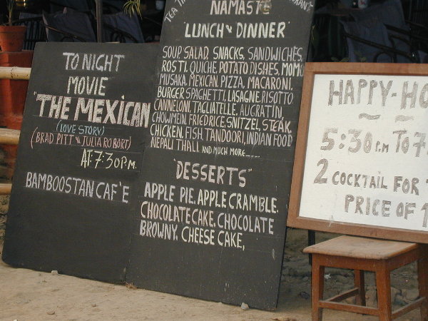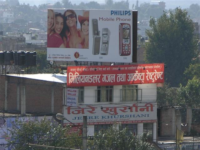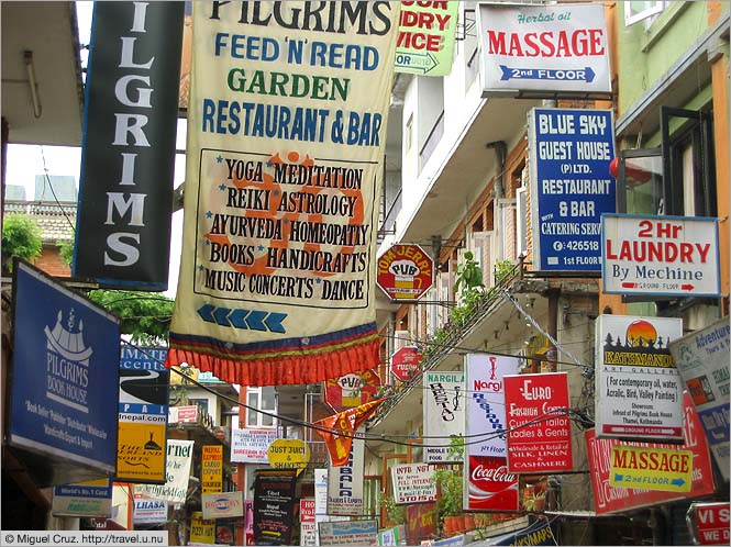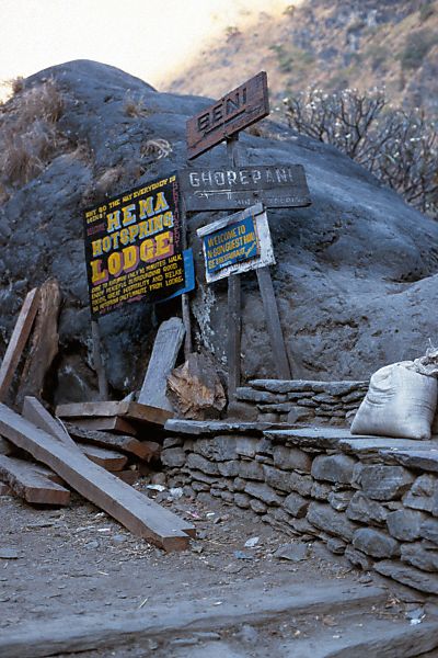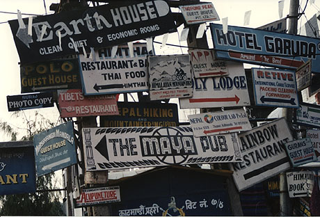 Nepalipoonte, Kaha Ratopani/Gharkhola ko sign post garna bhyaeko. Tyahi bato ma 1997 ma hidda missed that sign and walked for may be half an hour towards Beni instead of climbing to Ghorepani. Tatopani bata aunda jholunge pul tarna sath ukalo lagnu parne, kina Kali Gandaki ko cheu nai hideko hidyai cha bhaneko ta sign nai miss gariecha. Ani farkera tyahi Hema Lodge ma chiso khaera pheri ukalo lagiyo. That picture made me nostalgic. Tyo Target pasal chahi kata paryo ni? Herda ta New Road tira jasto dekhincha. Kupondole ma KMart (ani tesko talapatti Kupondole Mart lekheko) sign pani dekheko thie. Interesting spellings on the Thamel ka signs. Mechine (4:13 ko posting ma), Robort and Cramble (4:33 ko posnting ma).