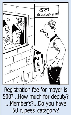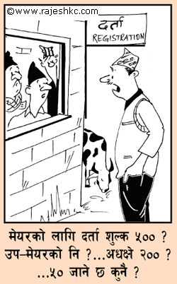 What a joke... This reminded me of the time when 34 candidates - all from different walks of life, filed for the post of prime minister one and half yr ago... I cant help laughing.. hahahaha ---------------------------------------------------- Colorful candidates mark the day Kantipur Report KATHMANDU, Jan 27 - Radha Upadhyay, a peon at a school, knows little about politics and democracy. Nor has she any idea of what Dr Tulsi Giri calls - "re-energization of democracy". She filed her candidature for the post of chairman of ward 4 of Kathmandu Metropolitan City in the upcoming municipal elections. But it was not to participate in democracy, but to "please" her boss, the school headmaster of Basuki School at Pashupati Temple area. Unlike most candidates who avoided journalists and cameramen, she faced questions from the media with elan, like a seasoned politician. Well almost. "My headmaster is here and I filed my nomination as per the request of my headmaster,” Upadhyay told journalists, as she emerged from the City Hall gate. "I do not know any politics and democracy." When asked why she filed her candidature, she said, "The school does not give money to me." Was it for money then? She shied away and declined to say anything. Sushma Sharma Baral of Nepali Shanti Kshetra Parishad wanted to become mayor of Kathmandu. So she went inside the City Hall. But returned soon. Chairman Baral's reasoning was there was some technical problem about her 'party'. But her 'party member', some Ghanendra Basnet, said Baral's name did not figure in the voters' list! A candidate who had arrived at Bhaktapur election office to file his papers was not allowed in after policemen contacted the officials inside. The reason? He had come with a banner which read jana ganatantra (people's republic). The scene before the election offices was marked by conspicuous absence of political activity surrounding the filing of nominations. No sloganeering. No political activists. Three fresh posters calling people to take part in the election were posted on the wall outside the office. A sack of flags belonging to Nepal Samata Party was lying against the wall. Police were posted along the Bhrikutimandap Road and only 'candidates' who whispered into the waiting policemen's ears were allowed to enter the City Hall premises. After the EC officials accepted their applications, all the candidates were taken upstairs and briefed about security arrangements. The candidates said they risked their life for the nation but said they would consult the Home Minsiter again in connection with security. When asked about how he can go to the people for votes, Shanta Lal Karmacharya, a Social Democratic Party candidate for Mayor's post said, "It is the cadres who go door to door for votes." Most aspiring candidates declined to reveal their identity too. The police then let them go without checking. In Banepa Municipality, it was strictly a family affair. Ganesh Lal Shrestha and his wife Lila Devi Shrestha were the only ones to file for the post of mayor and deputy mayor. It was another husband and wife affair in Nepalgunj, but of a different kind. Bhuwan Krishna Shrestha, who filed his candidature for the post of mayor in Nepalgunj Municipality, decided to withdraw his candidacy as his wife reached the election office, weeping. He is the district president of Rastrabadi Milan Kendra. Zonal Administrator Min Bahadur Pal and Chief District Officer of Nepalgunj, Binod Adhikari, were very frantic throughout the day. They were busy searching for possible candidates. Then Pal called an emergency meeting of royalists and forced three royalists to file their candidacy. The BBC Nepali Service reported that police escorted aspiring candidates to the election office. Posted on: 2006-01-26 19:50:11 http://www.kantipuronline.com/kolnews.php?&nid=63789