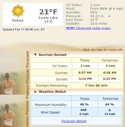 It's february morning and sunny outside. Currently: 12°F Clear Currently: -11°C Clear Wind: Northwest at 3 MPH Humidity: 67% Dewpoint: 3°F Barometer: 30.21 inches and steady Wind Chill: 7°F Wind: Northwest at 4 KPH Humidity: 67% Dewpoint: -16°C Barometer: 1023 millibars and steady Wind Chill: -13° C Sunrise: 6:49 am Sunset: 5:11 pm
