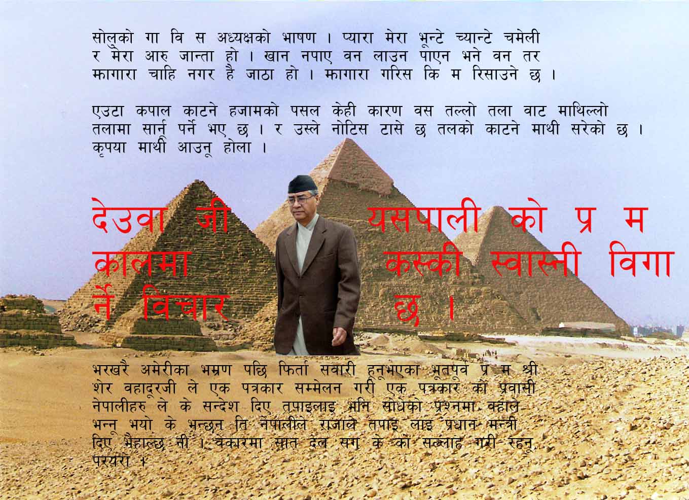 NOTE: The opinions here represent the opinions of the individual posters, and not of Sajha.com. It is not possible for sajha.com to monitor all the postings, since sajha.com merely seeks to provide a cyber location for discussing ideas and concerns related to Nepal and the Nepalis. Please send an email to admin@sajha.com using a valid email address if you want any posting to be considered for deletion. Your request will be handled on a one to one basis. Sajha.com is a service please don't abuse it. - Thanks.