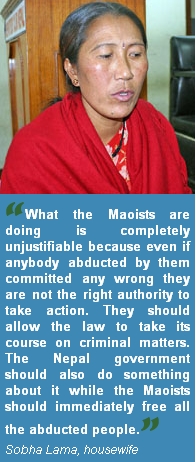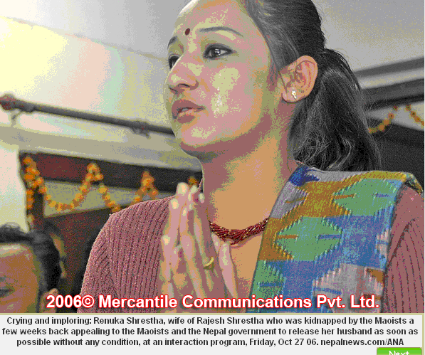 Maoist excesses continue; Family members demand release of their dear ones A Dalit youth has accused the Maoists of torturing him for three days on the charge of stealing money from a hotel owner. Kancha Tamang alias Padam Sarki, 27, a native of Ranke Bazaar of Pauwasartap VDC in Panchthar, was charged with stealing Rs 32,000 from the hotel of Kamal Budathoki at Ranke bazaar on October 23. The next day the Maoists caught hold of Sarki and took him away, only to subject him to extreme physical torture for three days. Sarki has sustained severe injuries in his hands, legs, feet and face. Sarki said the Maoists released him Thursday after they found only Rs 7 on his person. They have, however, directed him to pay Rs 40,000 to Budathoki. Sarki said he never stole any money from Budhathoki, reports The Himalayan Times Daily. This is one of the incidents in a series of Maoist excesses after they agreed to join the political mainstream leaving the politics of violence. Meanwhile, the Families and close relatives of those abducted by the Maoists have called for the immediate release of those in Maoist custody. “My husband Sunil Thapa, a restaurateur, was abducted by the Maoists on October 6 from Mahankal,” Roshani Thapa, who is expecting a baby, said at a press meet in the Capital on Friday. Sunil, according to her, is being kept in Maoist captivity in Godavari. Twenty-eight-year old Umesh Shrestha was abducted from his house in Bhaktapur on October 10 and is currently being held in Godavari. “A group of Maoists came to our house and abducted my son Umesh. Likewise, the Maoists came on October 12 and took his motorbike right from our premises,” Ramesh Shrestha said. “I saw the Maoists claim on TV a few days back that they had confiscated the bike, which is completely false,” he added. Nar Bahadur Shrestha said his son Rajesh Shrestha, who was running a hardware shop in Dhumbarahi, was abducted by the Maoists some 10 days ago from Dhumbarahi. Twenty-three-year old Rajesh is also being detained at the brewery. Kisan Lama said her husband Krishna Shrestha, the breadwinner of the family, was abducted by the Maoists on October 14. The Maoists abducted Krishna from a motorcycle workshop in Banasthali, Kathmandu. In yet another incident of Maoist atrocities, the Maoists have threatened and warned Federation of Nepalese Journalist (FNJ), Khotang President Dambar Singh Rai. The Maoists' Khotang district secretary Asmita and district in-charge Pasang threatened and manhandled Rai, who is also a Kantipur correspondent, accusing him of transmitting news about the kidnap by the Maoists of a Nepal Army official. The rebels had not even spared the sports ground and has been occupying the Technical Football Training centre in Dharan, built under the FIFA funded ambitious Goal Project at Bicha Ghopa since October 5. According to The Kathmandu Post daily, three dozen Maoist cadres of the second battalion of Ratna Kumar Sakunta Memorial Brigade of the Mechi-Koshi region have been staying at the centre whose construction is yet to be completed. The Maoists have also stationed a sentry at the flagged entrance. In a report from mid-western town of Nepalgunj, Maoists have forcibly used the residential building of state-run Nepal Television (NTV) at Kohalpur to accommodate their cadres since Thursday. Around two dozen rebels led by Maoist commander Sandesh are staying in the building. nepalnews.com pb Oct 28 06