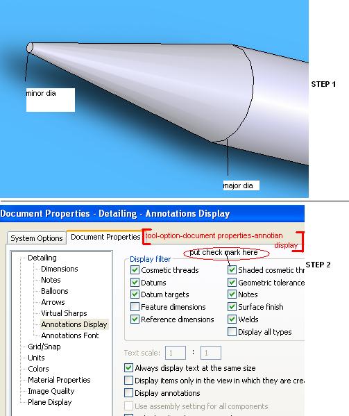 nepali dude, i m not sw guy but i have sw at home so i spent some time. It displays good for cylindrical face but due to some reason that crap doesnt appear in conical solid drawint though it exists there. But it comes perfect in orthographic drawing. Image is here, if u think it is ok, i will tell you the procedure. chill out!