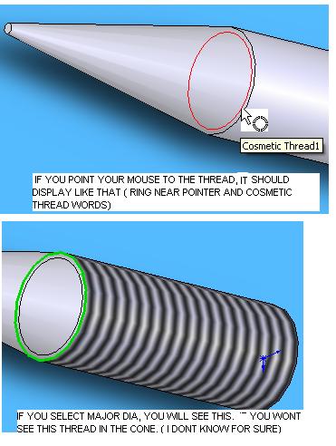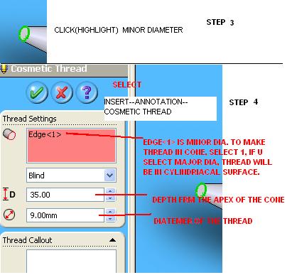 Step 3 shows to highlight the minor dia. Step 4 shows the option for the thread.