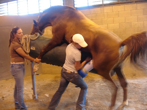 Collecting semen for an artificial insemination.