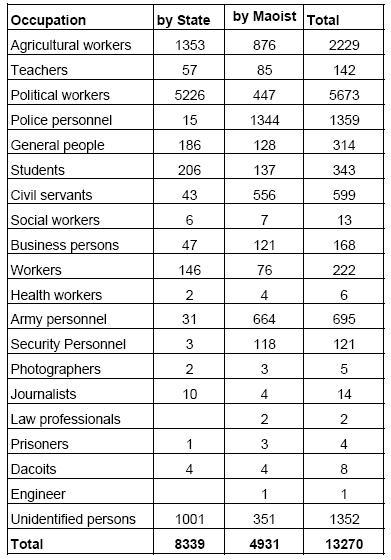 Number of people killed by the government: Year Killings ----- --------- 1996 ---- 59 1997 ---- 16 1998 ---- 334 1999 ---- 328 2000 ---- 180 2001 ---- 243 2002 ---- 3296 2003 ---- 1217 2004 ---- 1606 2005 ---- 815 2006 ---- 245 For details: - http://www.inseconline.org/hrvdata/Total_killings.pdf And before you think the people killed were all Maoists combatants, here is the list of classes of people killed by both the Maoists and the government. .