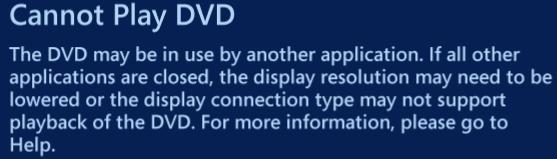 Hello All! I am having trouble playing DVD in media center PC. The problem started when I re-installed OS after my PC crashed suddenly which inturn deleted the restore partition of the harddisk provided by DELL. I installed OS from the DVD. I am attaching the error message. I also tried playing in Media Player, but I recieved the following error message (Windows Media Player cannot play this DVD because there is a problem with digital copy protection between your DVD drive, decoder, and video card. Try installing an updated driver for your video card.) I have lattest driver for the video card. Any suggestions will be greatly appreciated.