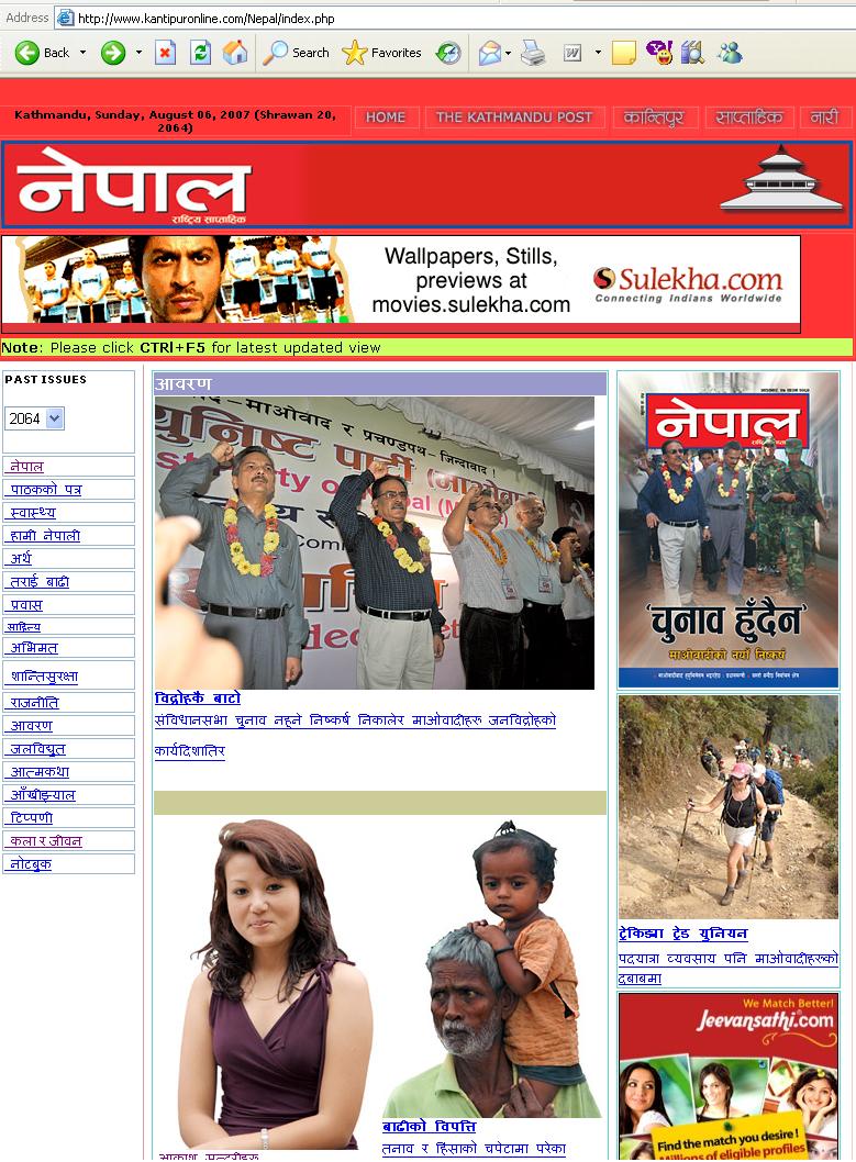 wow even i hadn't noticed the mouse like thingy on the little girl's head and aug 6th being on sunday instead of monday. good observations supari & thula. anyways, i thought the google ad? at the top of the page was kinda funny but more like sad to see "connecting indians worldwide" on a nepali news site. i guess we get a lot of indian interests on our current events!?!?! shakeen, i did think about giving the pic G rating but rated it PG13 for having matrimonial ad