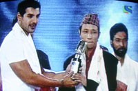 Prasanta Tamang receiving the Indian Idol Award from actor John Abraham.