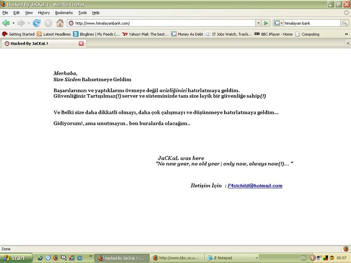 Beware Guys. My surprised! There website was hacked by JaCKal! Now, site down, I was able to screen capture on UK time 12:07 am . I was thinking to post before, but didn't. Actually, I am planning to visit Nepal after few month, and want to open nepalese bank account which offer online banking, and search himalayan bank and my surprised found himalayan bank website was hacked. Very poor web security and poor website admin of himalayan bank. I hope himlayan bank published this insident to public.  Do, anybody have experienced of online banking to any nepalese bank. Raru, From UK