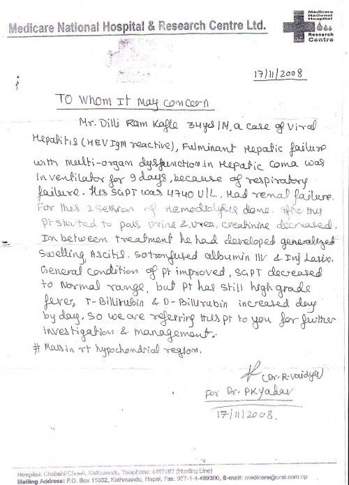 This is Ram Chandra Kafle, Ph.D. student at Indiana University Purdue University, Indianapolis, writing this letter on behalf of my brother Mr. Dilli Ram Kafle who had been hospitalized in MEDICARE HOSPITAL since 10/25/2008 due to acute liver failure. After spending about 12 Lakhs in Medicare, the doctors involved in his treatment referred him to APOLLO HOSPITAL, New Delhi. The estimated cost for the treatment in APOLLO HOSPITAL would be Rs. 32 lakhs( 20 lakhs IC). For a middle class family as of Dilli, who is basically from Kakarvitta -10, Mechinagar, Jhapa and currently a lower secondary teacher at Ratna Rajya School, Ramkot, Kathmandu, it is almost impossible to manage that huge sum of money. In this context I would kindly like to appeal to all fellow Nepalese residing here in US, to help in his treatment. Your small contribution could be a large support and aspiration for our family.