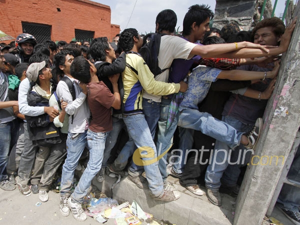 Youths jostle in a queue to get forms for Korean Language Test exams to qualify for employment in South Korea under Employment Permit System (EPS) at Gaushala, Kathmandu on Monday.