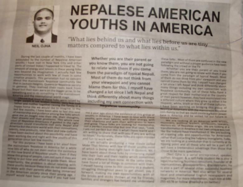 During the last couple of months, I have been astounded by the number of Nepalese American youths I have met in New York City and other parts of United States I happened to travel to. The amount of energy and talents in these young folks was beyond my imagination. I actually had few opportunities to work with few of them in some creative projects. This generation had no concern about the mainstream Nepalese community like that in Jackson Heights, Queens or Nepalese society in general. They realized their roots back from Nepal but their eyes were on the bigger prize, to be something and to do something in the mainstream America and the international world stage.